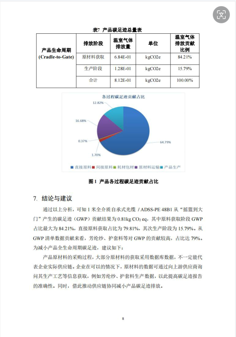 2023 年公司委托第三方參考《ISO 14067:2018 溫室氣體 產品的碳足跡 量化要求和指南》標準規范,針全介質自承式光纜/ADSS-PE48B1 產品開展了全生命周期的碳足跡評價,計算得到產品全生命周期碳足跡總量為 0.812kgCO2 當量,產品碳足跡評價報告(截選)見附件 2。