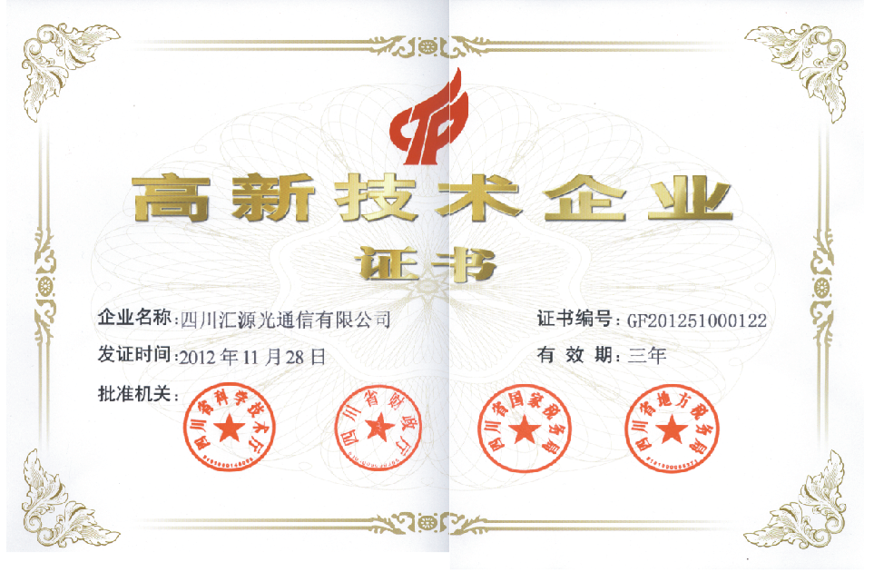 四川匯源光通信有限公司于2012年11月28日順利通過了國家級高新技術企業復審,并于2013年3月14日收到了由四川省科學技術廳、四川省財政廳、四川省國家稅務局、四川省地方稅務局聯合頒發的《高新技術企業證書》。