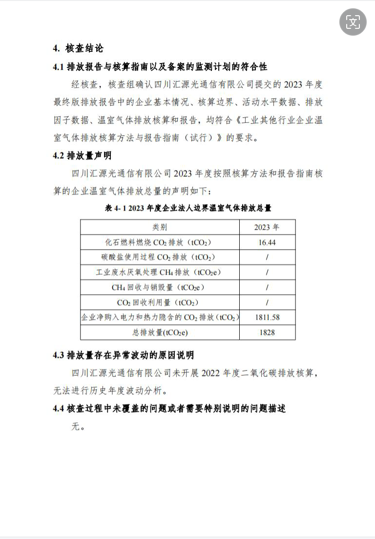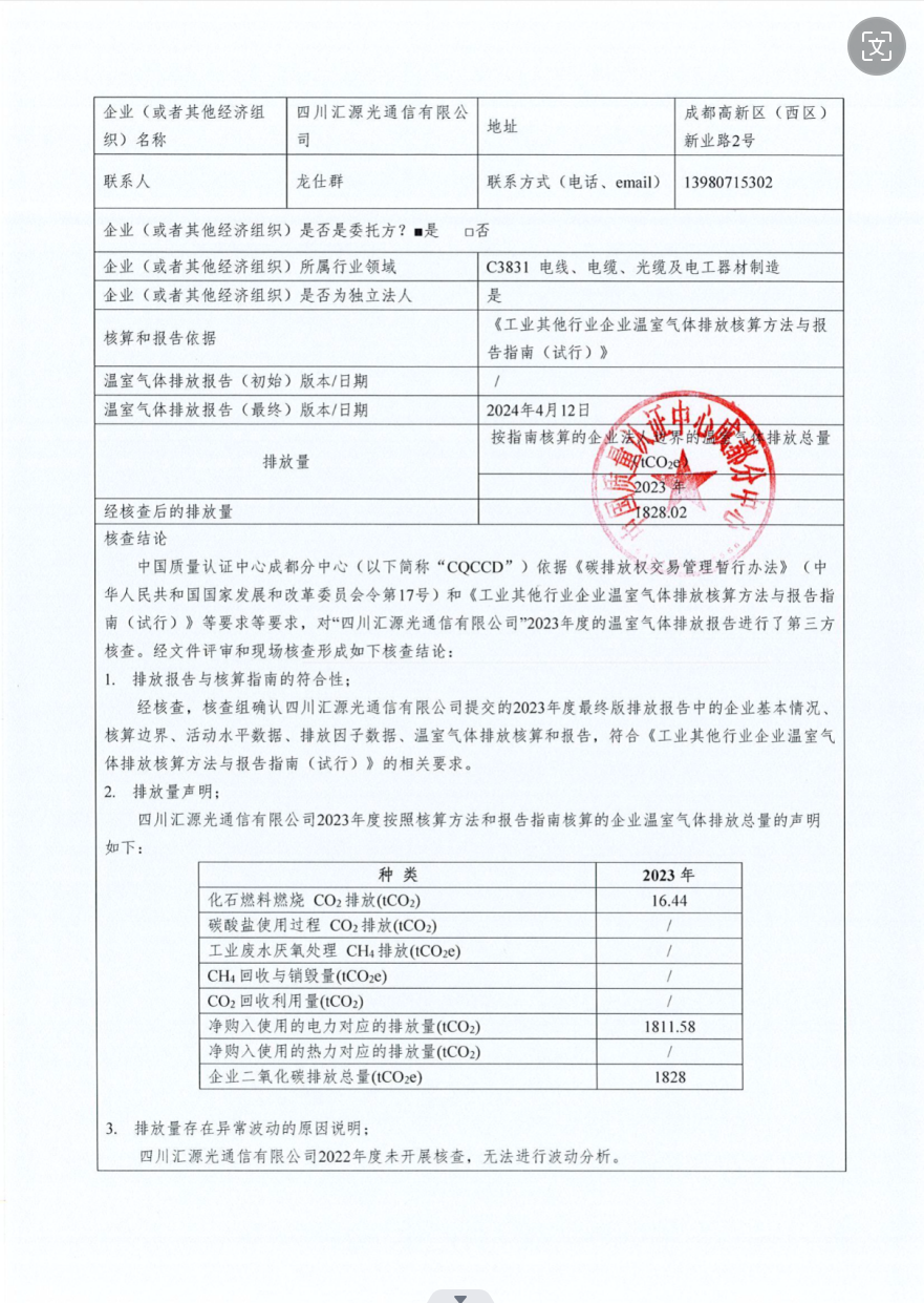 四川匯源光通信有限公司踐行低碳循環經濟,積極響應國家與集團節能降碳政策,對廠內溫室氣體進行自查核算,委托第三方開展核查核證工作,同時注重產品層面的碳評價,并委托第三方開展了典型產品碳足跡評價工作。現將核查結果予以公示: