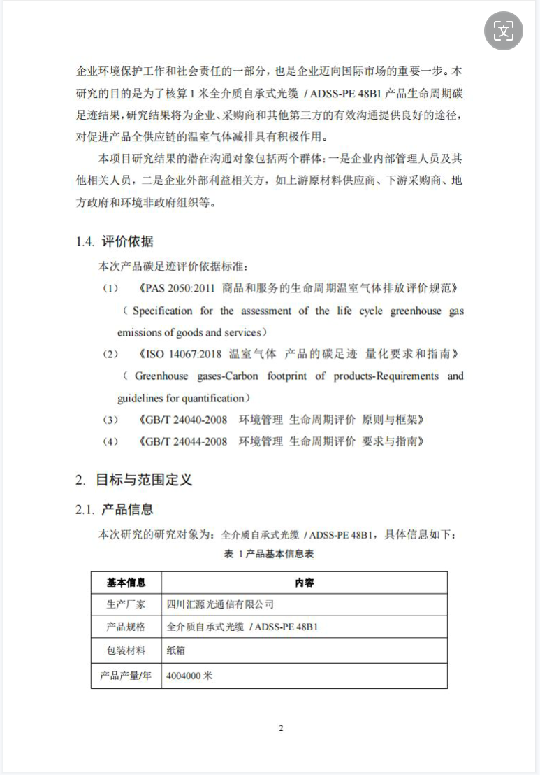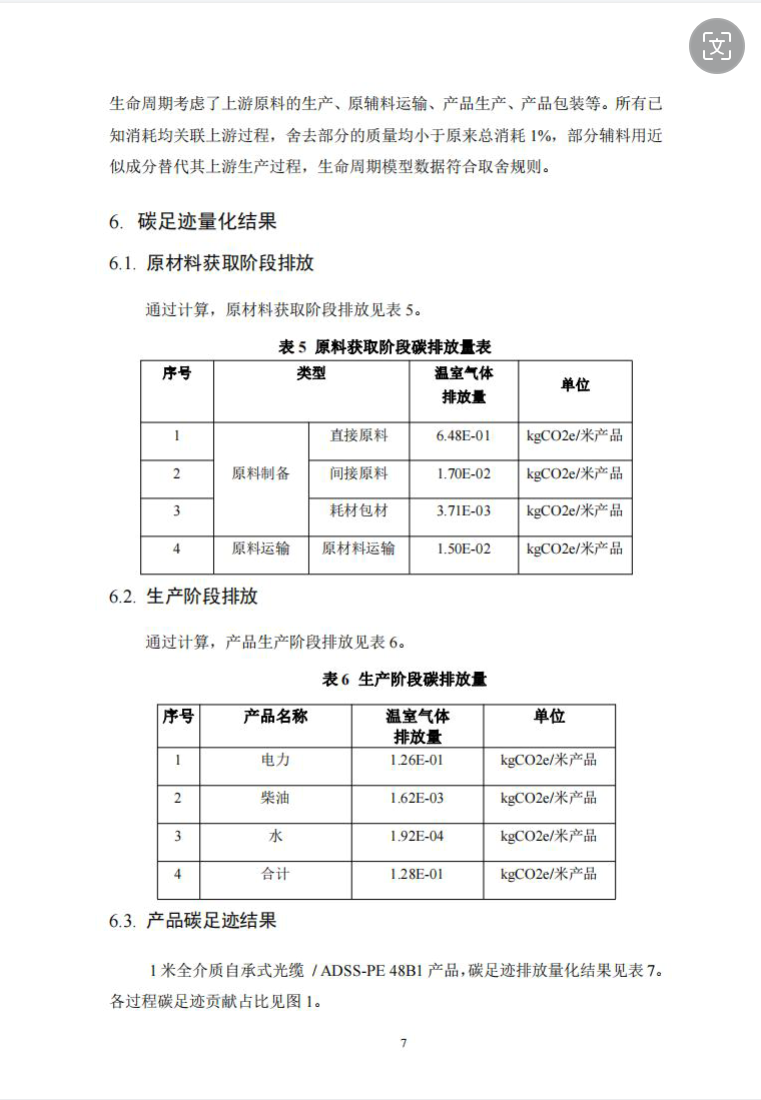 2023 年公司委托第三方參考《ISO 14067:2018 溫室氣體 產品的碳足跡 量化要求和指南》標準規范,針全介質自承式光纜/ADSS-PE48B1 產品開展了全生命周期的碳足跡評價,計算得到產品全生命周期碳足跡總量為 0.812kgCO2 當量,產品碳足跡評價報告(截選)見附件 2。